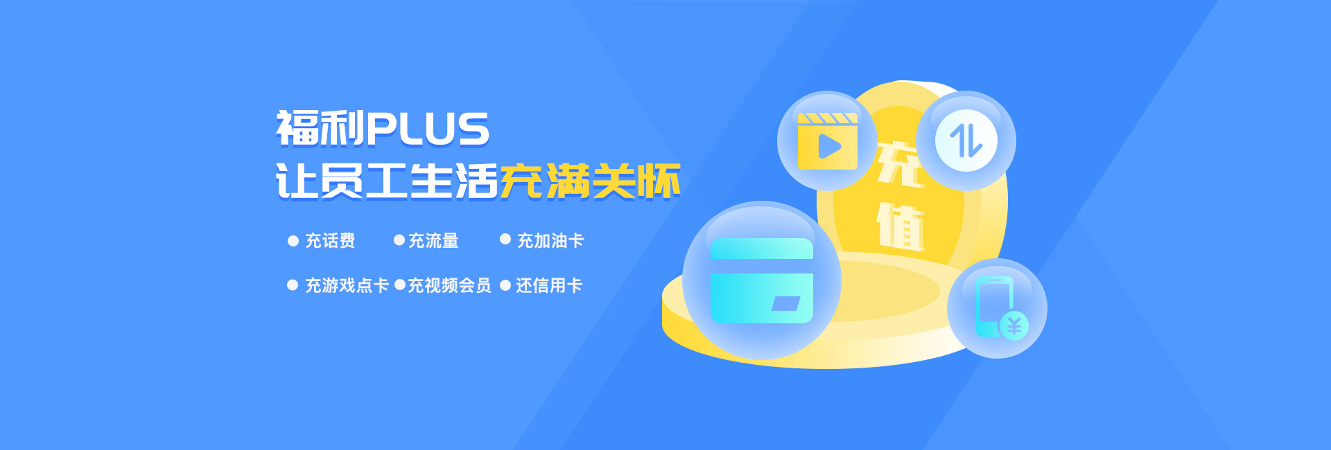福利PLUS携手国内品牌供应商,整合行业资源,提供超过100万种商品,覆盖员工的衣食住行、休闲娱乐、生活服务等方方面面。企业分配给员工的福利积分支持手机话费充值、加油卡充值、水电煤缴费、视频会员、游戏点卡充值,同时,还支持信用卡还款功能。